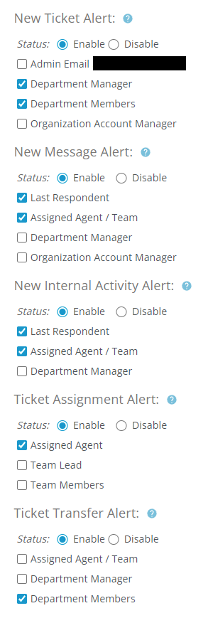 Hey everyone. osTicket noob here. I'm trying to finalize our installation and we've got most things working well, but we are not getting any notifications when a new ticket is created. Here's my installation and environment details: