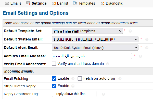 Also worth double checking the Admin -> Emails -> Settings panel. Mine looks as below, although yours will probably differ slightly. Key thing is that there is one method of polling the mailbox enabled: