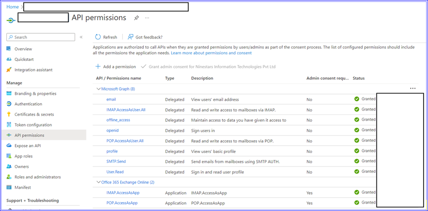 User.Read, offline_access, IMAP.AccessAsUser.All, POP.AccessAsUser.All, and SMTP.Send.