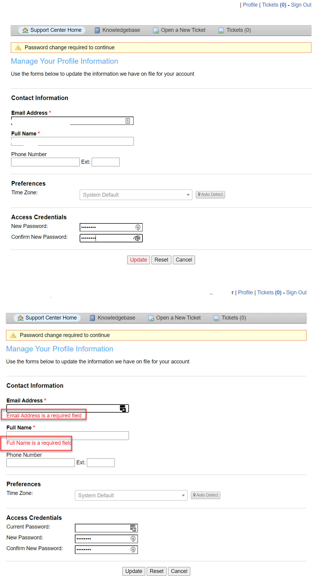 This is confusing to end users, because they think it didn't work, and they keep emailing us new support requests because the password reset isn't working, when in reality, it is just never getting to the Http::redirect('tickets.php') line in profile.php like it should.