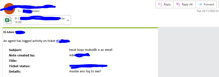 We experience this bug when we send a response with more than 1 attachments. The outgoing message with 1 attachment works fine, but when we send a response with 2+ attachments the email will have 1 less file. We have tested this with different amounts of files and with different files, and it seems that it’s a persistent problem. Otherwise, we don’t have any problems with outgoing e-mails.