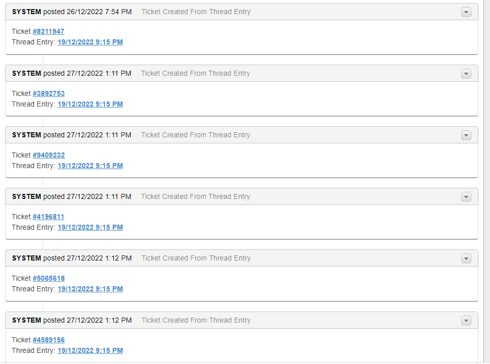 It looks like an agent opened tickets from thread entries within this ticket. Or maybe your system had a hiccup/bug at one point and generated duplicate or incorrect records. I can’t tell you why that happened as I don’t have visibility to your database.