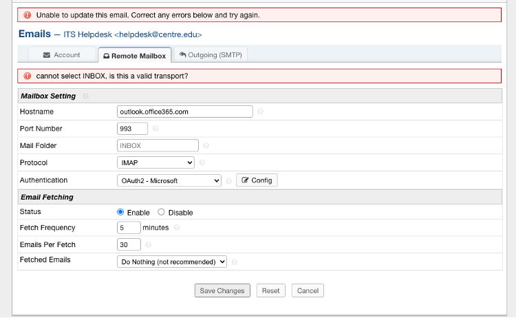 You need to get a token as the email itself, not a global admin or any other account. You can add something to the scopes and submit the popup to invalidate the current token. Then go back to the system, remove what you added, submit the popup again, and when you get redirected to MS login as the email you are trying to configure in the helpdesk. Once you do this it should authenticate successfully.
