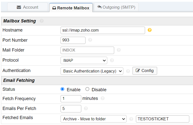 Can you save the email's Remote Mailbox config successfully? Do you have a valid cron job running and working? You can set your Default Log Level to DEBUG, wait for cron to run, and see if inserts a system log entry. If it doesn’t then your cron isn’t working.