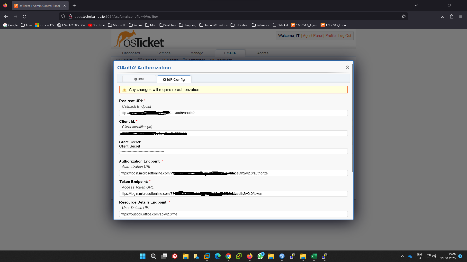 Admin panel -> Email -> <mymail>@domain.com (office 365 organization mail) -> remote mail box -> Config -> idp config here i have provided neccessary links from azure tenant (which created app registration).