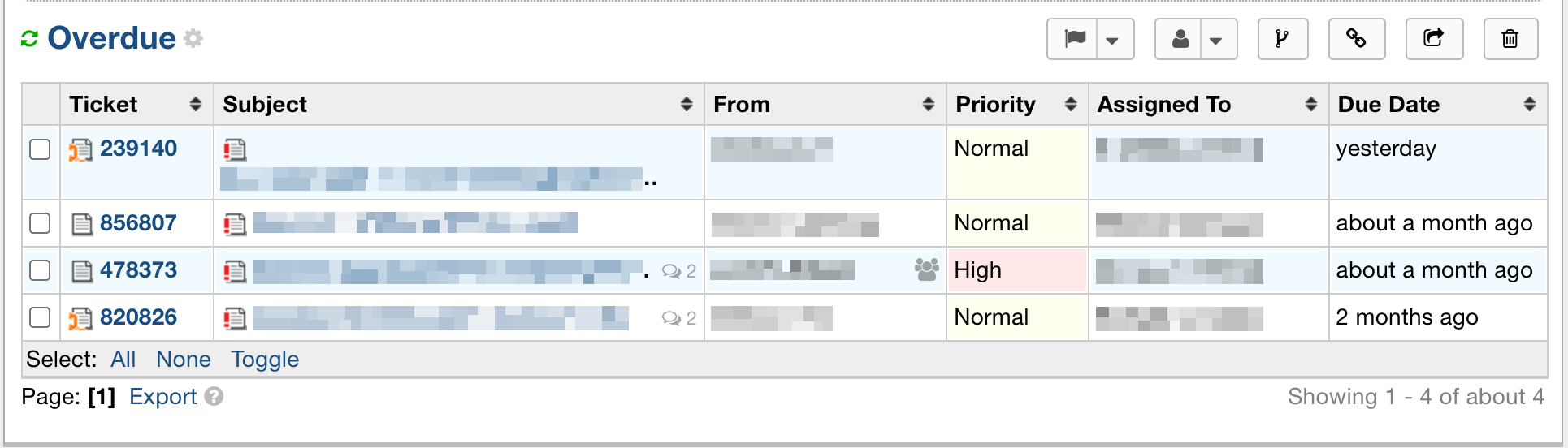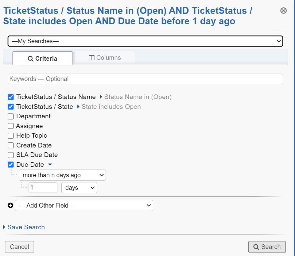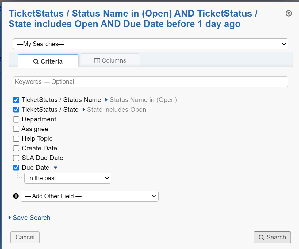 Only returns one ticket, #478373, when it should return several tickets that are currently overdue. Why isn't this search working?