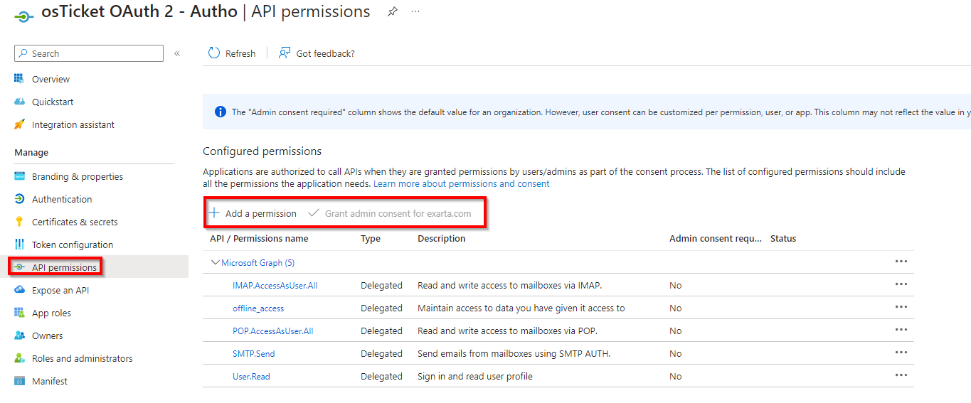 I am trying to set up a work email on osTicket. the link you shared above had some steps. The problem is, I can't "Grant Admin consent" using that email. The option is disabled.
