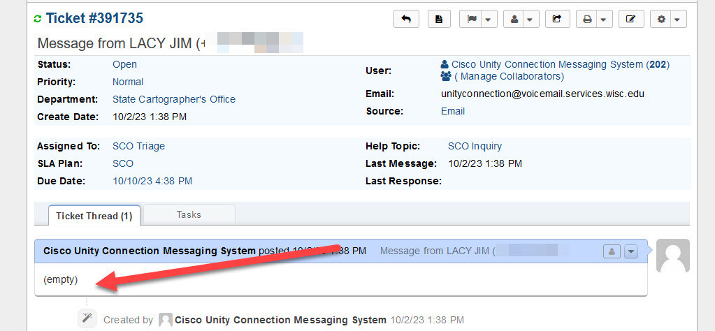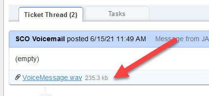 We choose to have voicemail messages from our university phone system sent to our helpdesk email as a .wav attachment. In the past, prior to the implementation of the oAuth stuff in OS Ticket, this worked just fine. A customer would leave a voicemail for us, campus voicemail system routes it to our inbox, which OS Ticket then picks up. All is well. This is what it used to look like: