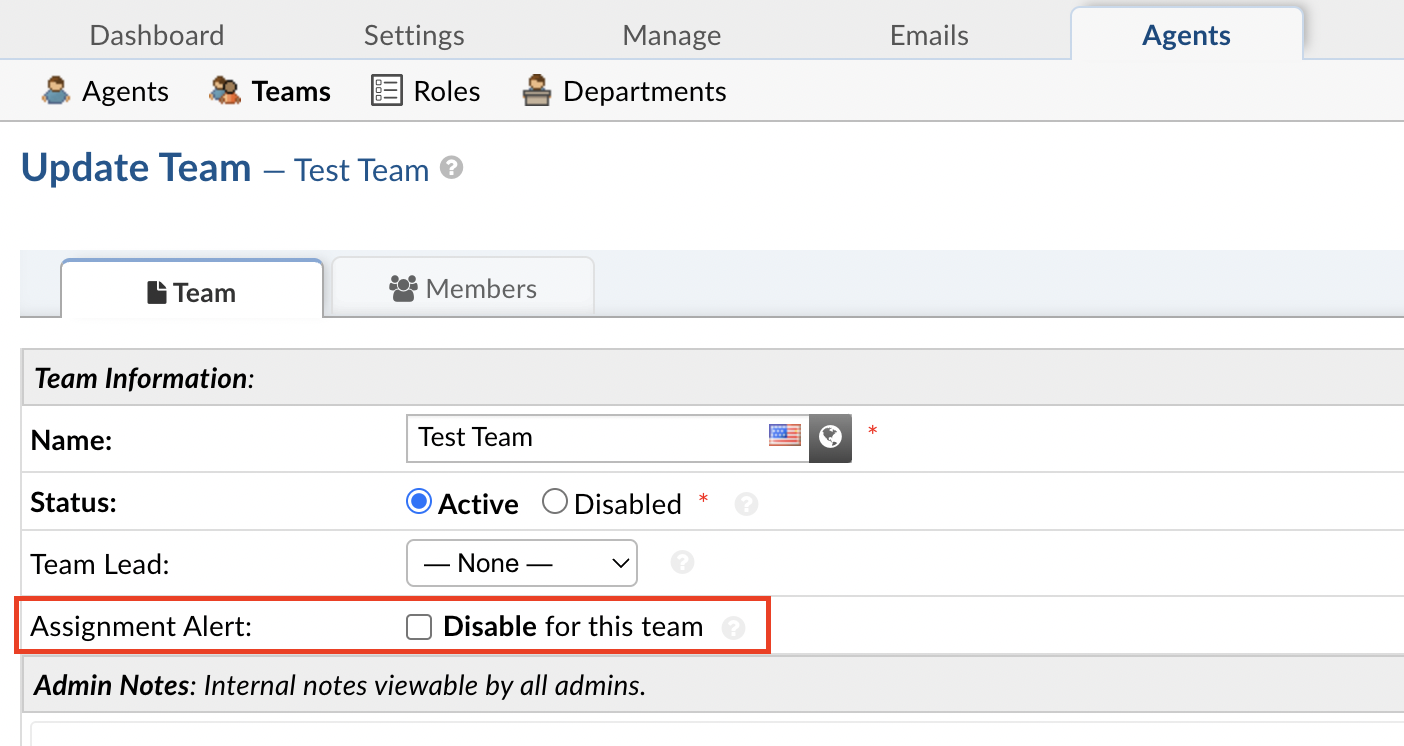 Then in the Team settings click the Members tab and ensure Alerts is checked for all Agents.
