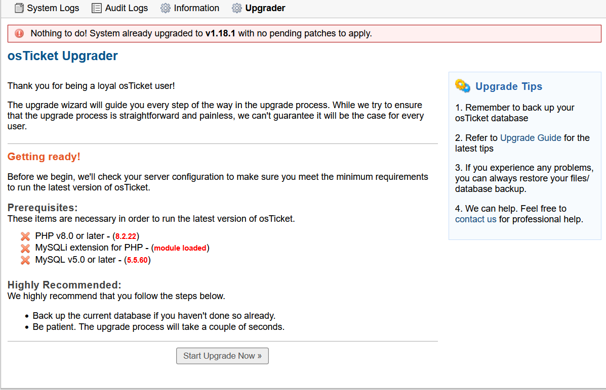 after following the mentioned steps "downloading and replacing upload folder content to my osTicket installation and restored the backed up ost.confg.php file and replaced currently installed plugins with the latest release it is showing on my info page it has been updated to V 1.18.2 but can't proceed with upgrading withard "screen attached" , aslo can't open ticketing system help desk it is giving iis error "screen attached"