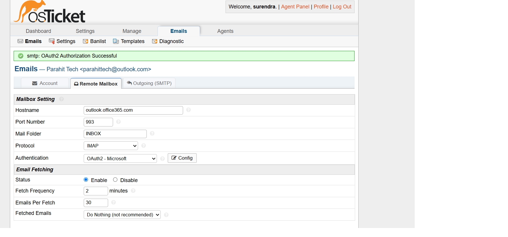 If that's for both the email in osTicket and the App Registration in Entra then that's good. Once you get the Token with the valid scopes and right user you make sure the Remote Mailbox tab has hostname, port, etc. configured and that the Status is set to Enabled. Then you Save Changes and ensure it save successfully. Then you make sure global fetching is enabled (Admin Panel > Emails > Settings > Email Fetching > Enable). Lastly, you make sure a valid cron job/scheduled task is running and you should be good to go.