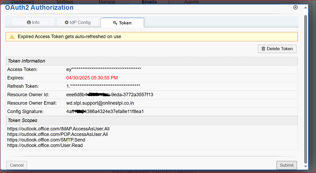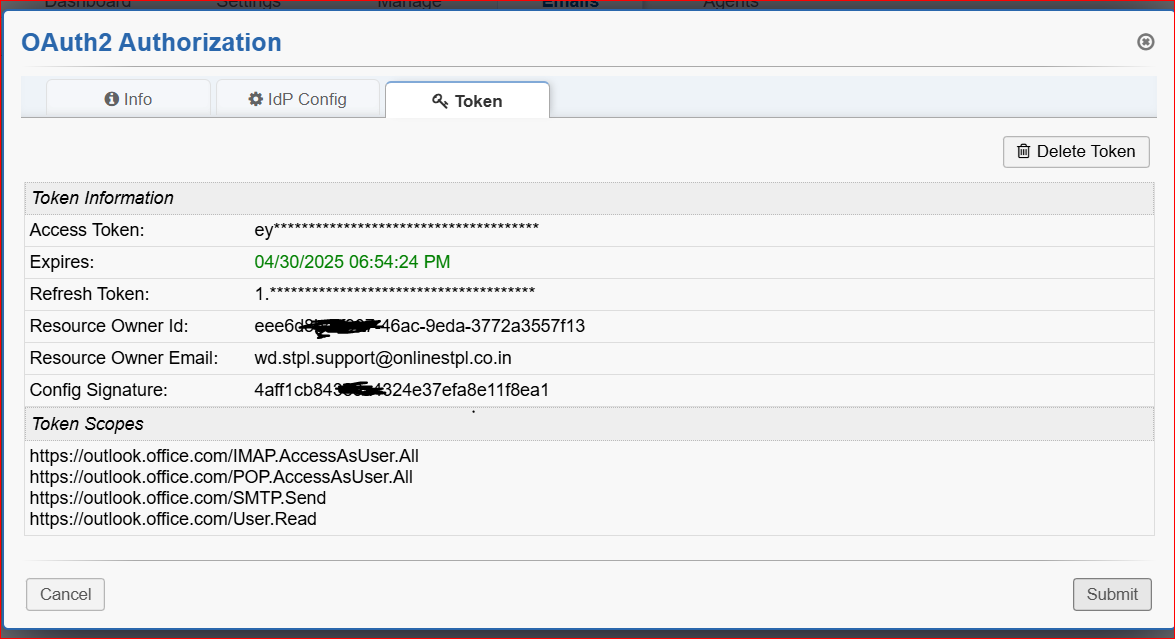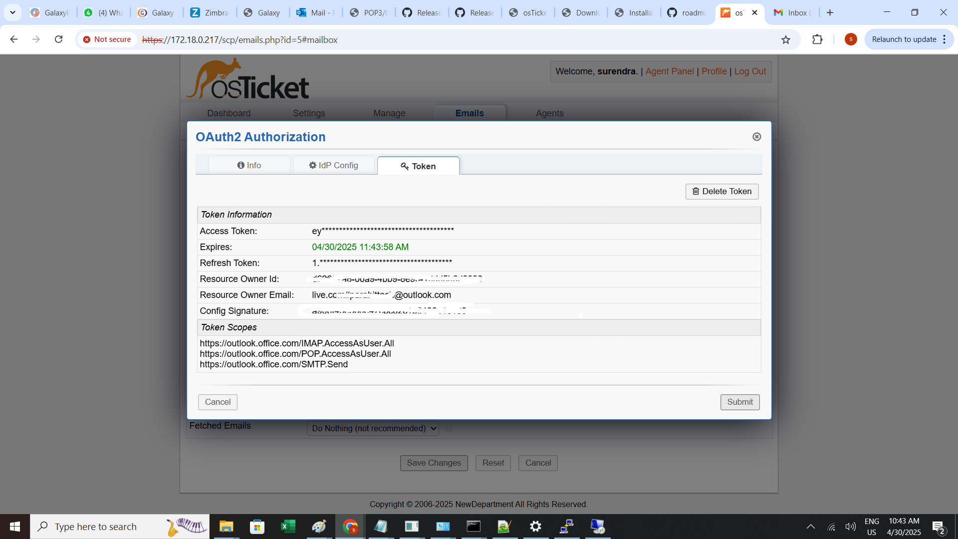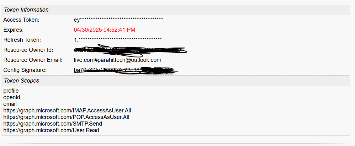 In your above screenshot of the token the Resource Owner is “live.comp…@outlook.com” (can’t see the full thing as it’s censored). The Resource Owner needs to be the email you are configuring in osTicket - in this case “parahittech@outlook.com”. Delete the current token via the button in the Authentication popup, resubmit the popup, and when you are brought to Microsoft you login as “parahittech@outlook.com”. Once you get a token for the correct user you can retest.
