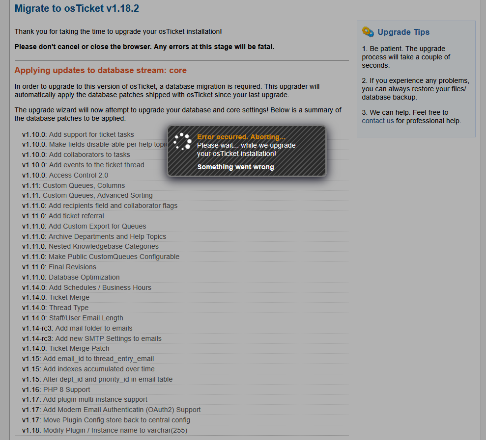 in the course of a server exchange we are currently trying to migrate our osticket to version 1.18.2 running on a new server. Unfortunately, when trying to upgrade the osticket we run into an error loop as you can see in the attached screenshot. Do you have similar problems or perhaps an idea how to solve this problem?