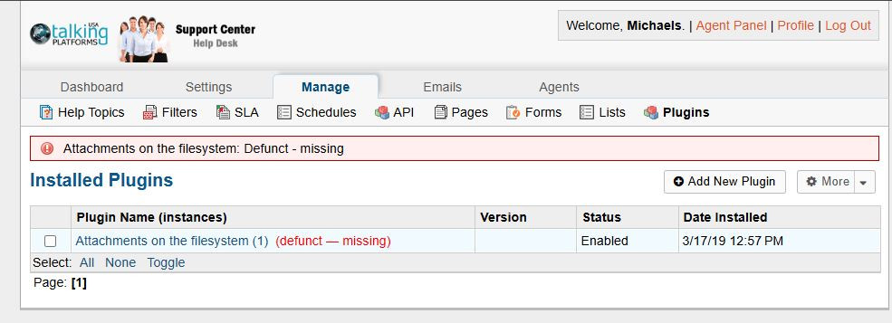 I updated version 1.15.5 to version 1.18.2, and everything seemed to be good, but when my techs went to download attachments, they could see the attachment, click on the attachment, and save the attachment, but it did not save anything. I went to the file attachment plugin, and it showed an error of (Defunct--Missing).