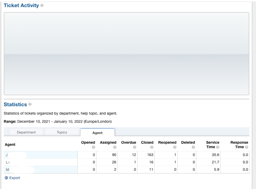 On this screenshot of Ticket Activity - Statistics, does Service Time mean number of hours?
