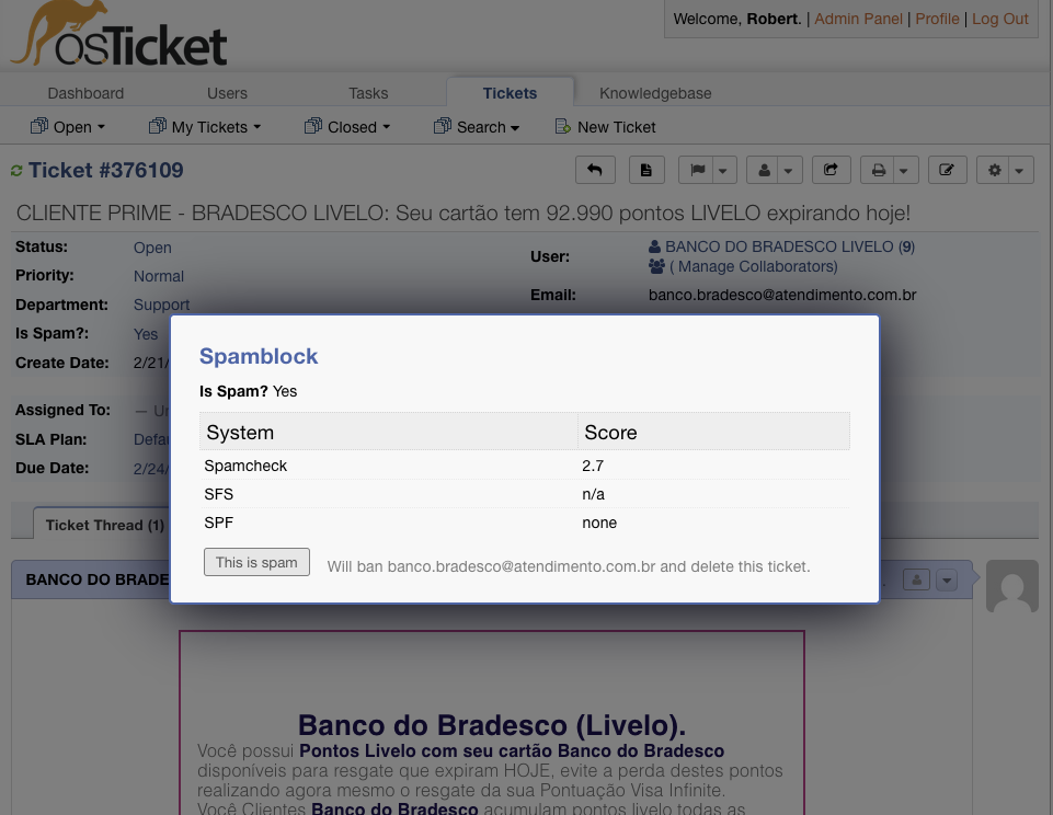 My webhost has pretty bad anti-spam, and so my ticket system gets a lot of spam. To help with it I made a plugin which uses 3 different systems (content analysis, SPF checks of the email domain, IP and email checks against known blocklists) and based on that can block spam. For scenarios where it does not block the spam, it also has a handy UI on the ticket to one click delete the ticket and put the spammers email into the OS Ticket block list.