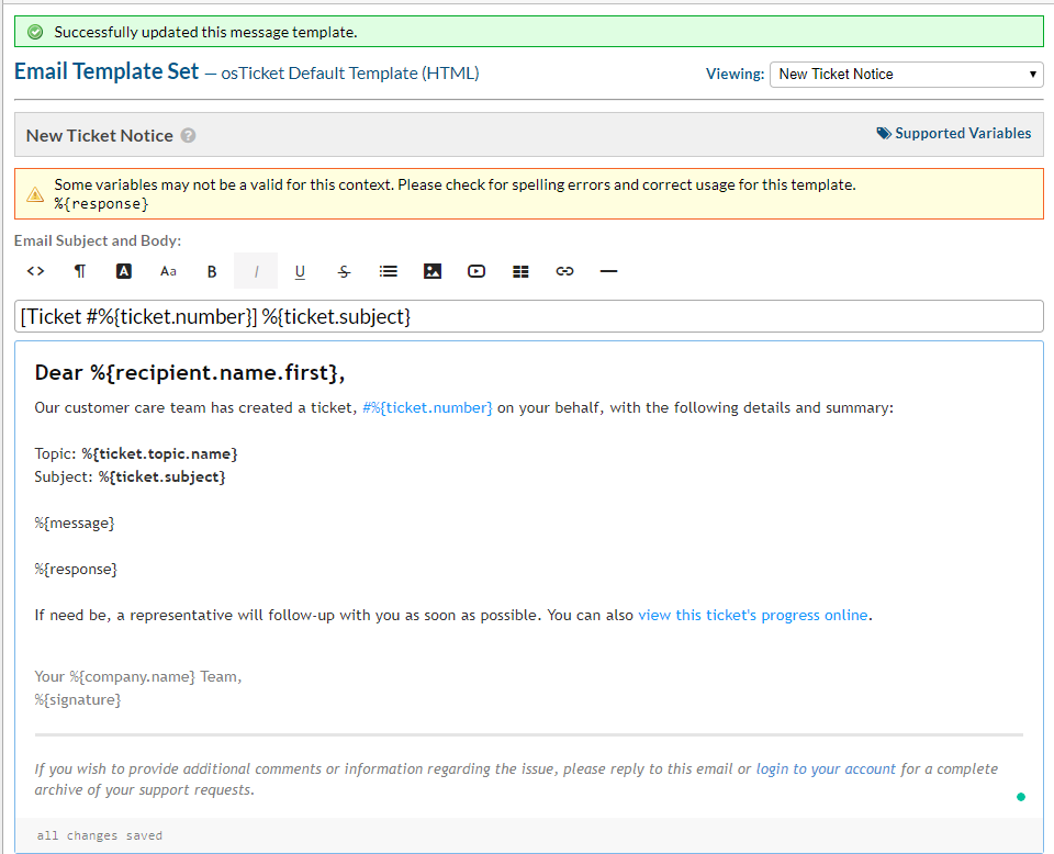 Nevermind, I believe this is an issue with the template. It does not have access to those variables. %{response} cannot be used in New Message Auto-Response, which is the user responding to their own ticket. So there must be other template/variable relationships that stop New Ticket Notice from working (ie. there is no %{response} for it to use).