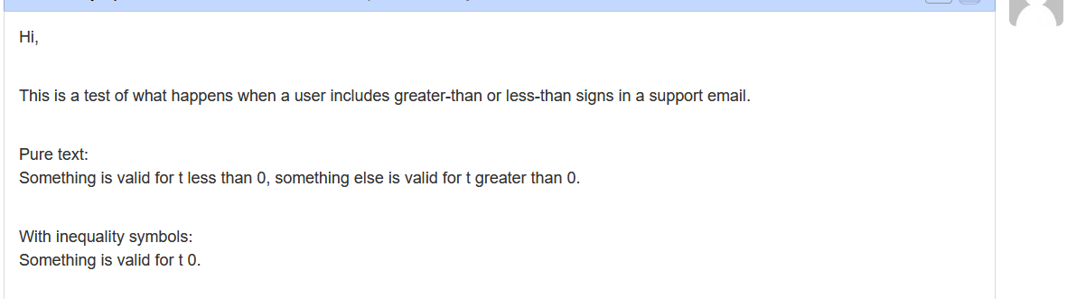 We have discussions with customers that involve them typing limited amounts of mathematics, so it is a problem for us that parts of the emails between less-than and greater-than signs get thrown away. It's customer content that is being redacted, so it can't be solved by telling our staff to be more careful.
