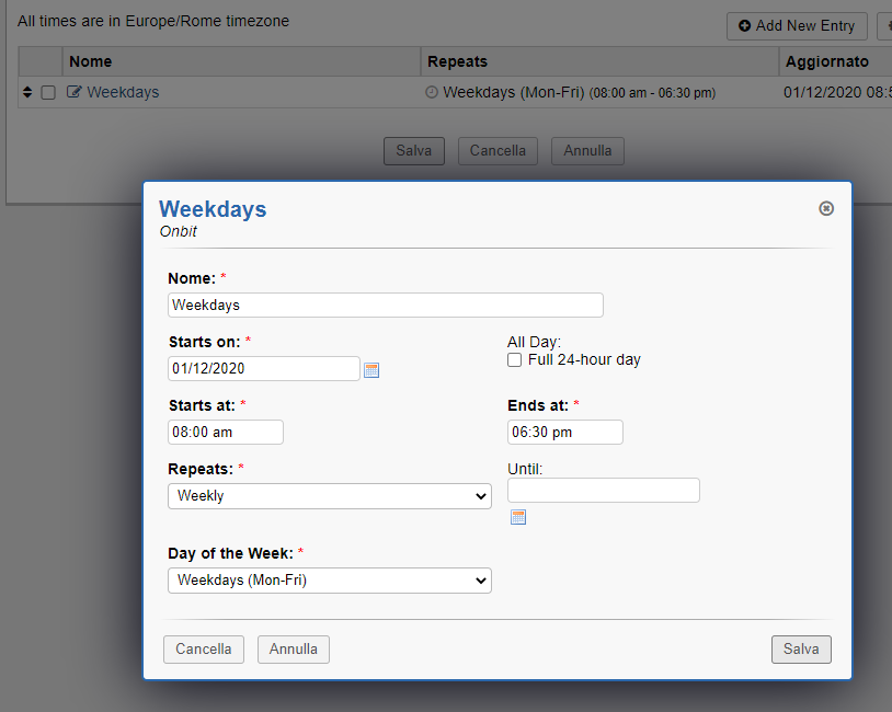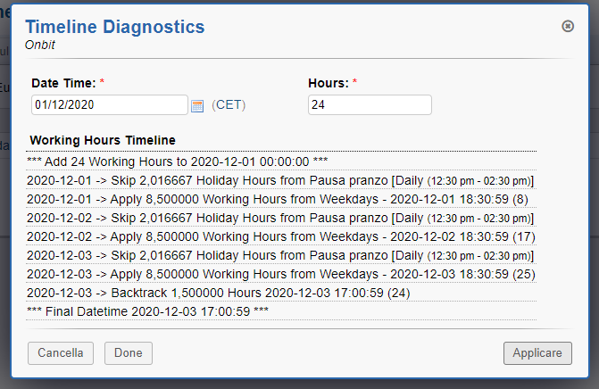 it's set in 2 working hours (8:00-12:30, 14:30.18:30, mon-fri, with Italian Holidays)