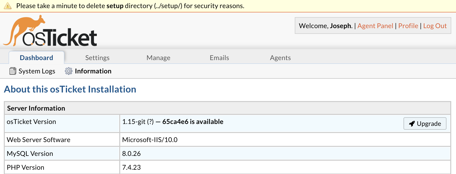 I never dealt with osTicket before. Now appeared an "upgrade" button in the Information tab.